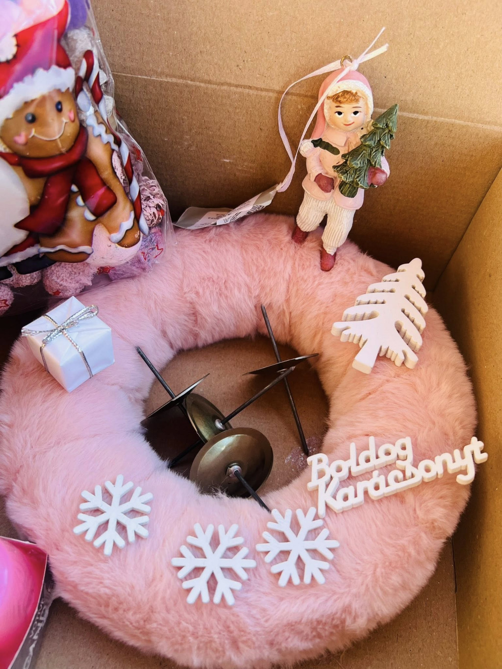 A puha, 2 cm vastag rózsaszín szörme alap tökéletes kiindulópont, amelyhez a rózsaszín figura, a 4 darab gyertya gyertyatüskével, valamint az apró díszek, termések, gömbök és felirat harmonikusan illeszkednek.