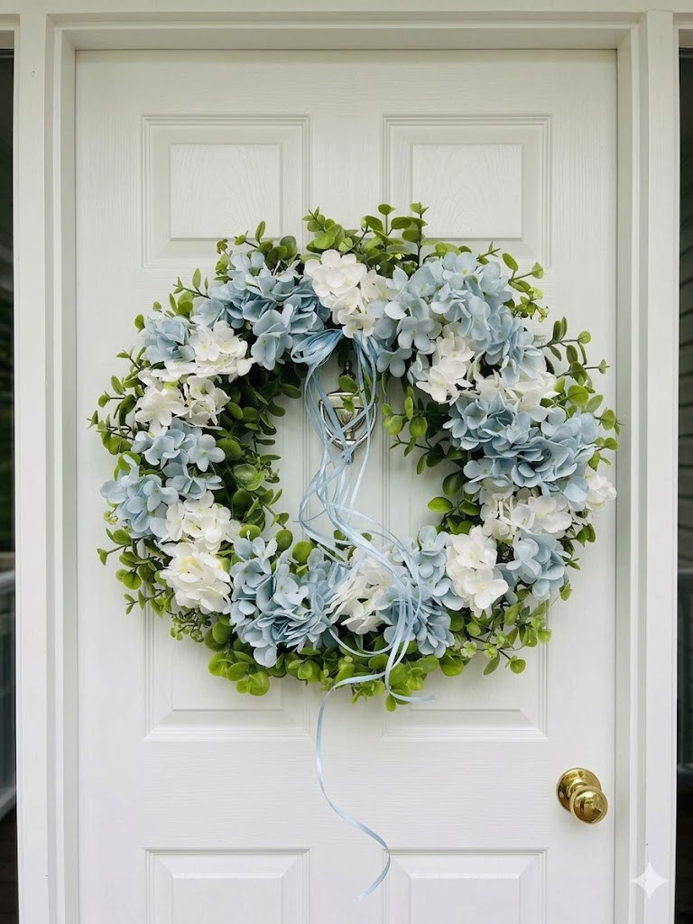 Ez a 47 cm-es ajtódísz elegáns és természetes hatású dekoráció, amely egy műzöld alapra épül, gazdagon díszítve fehér és kék hortenziákkal. A gondosan összeállított virágkompozíció friss, harmonikus megjelenést biztosít, amely bármely bejárati ajtót vagy falat feldob.