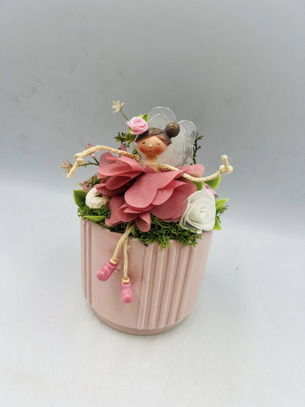 Ez a különleges, kézzel készített virágkompozíció kerámia kaspóban egy igazán bájos és meghitt hangulatú dekoráció. A finoman kidolgozott angyalkát idéző figura rózsaszín virágszoknyával ül a kaspó tetején, melyet élethű művirágok, zöld dekoráció és apró részletek tesznek még varázslatosabbá.