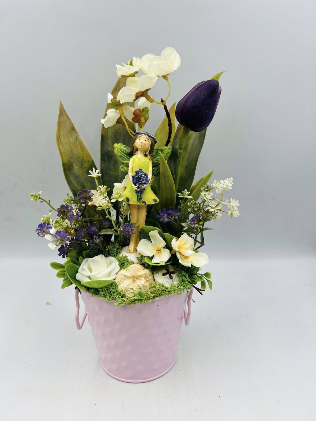 Ez a különleges anyák napi asztaldísz kaspóban egy igazán kedves és maradandó ajándék, amely tökéletes választás, ha szeretnéd meglepni édesanyádat vagy egy számodra fontos személyt. A kompozícióban harmonikusan jelennek meg a fehér és lila virágok, zöld levelek és egy bájos kis figura, amely még személyesebbé teszi az ajándékot.