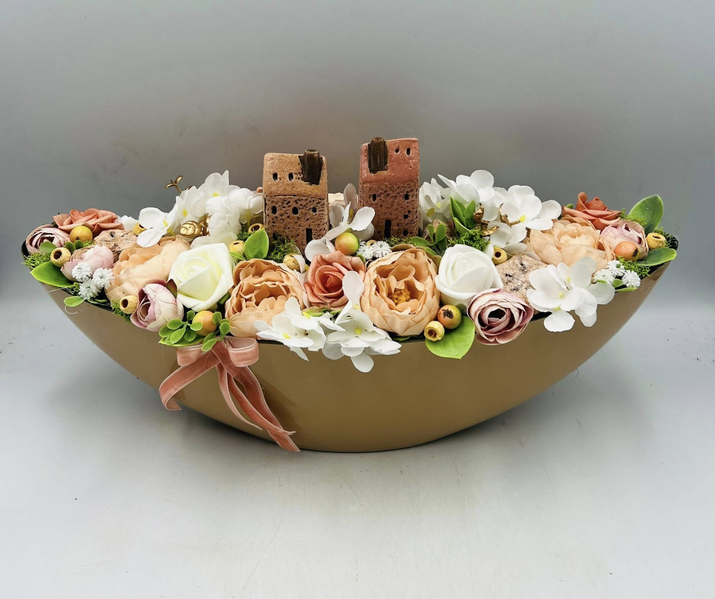 Ez az elegáns, 35 cm hosszú asztaldísz egy különleges formájú, bézs színű csónak kaspóban készült, amelyet két darab dekoratív házikó és harmonikus színvilágú virágkompozíció tesz igazán egyedivé.