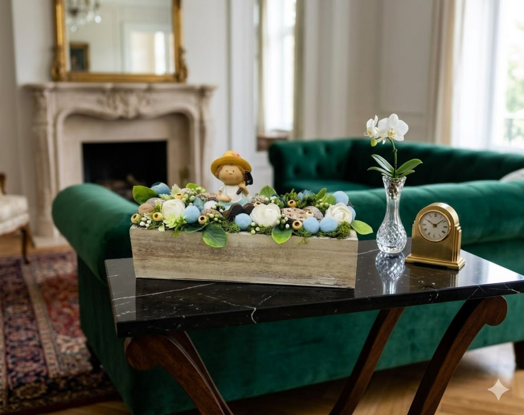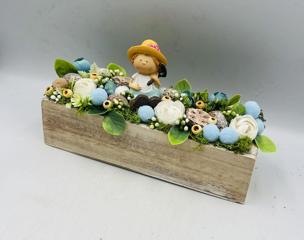 Kedves és természetes hangulatú dekoráció szürkített mintás faládában, amelyben egy bájos kisfiú figura kapott helyet. A kompozíciót kék-fehér, natúr stílusú díszítés, valamint zöld levelek és növényi elemek teszik igazán harmonikussá és esztétikussá.