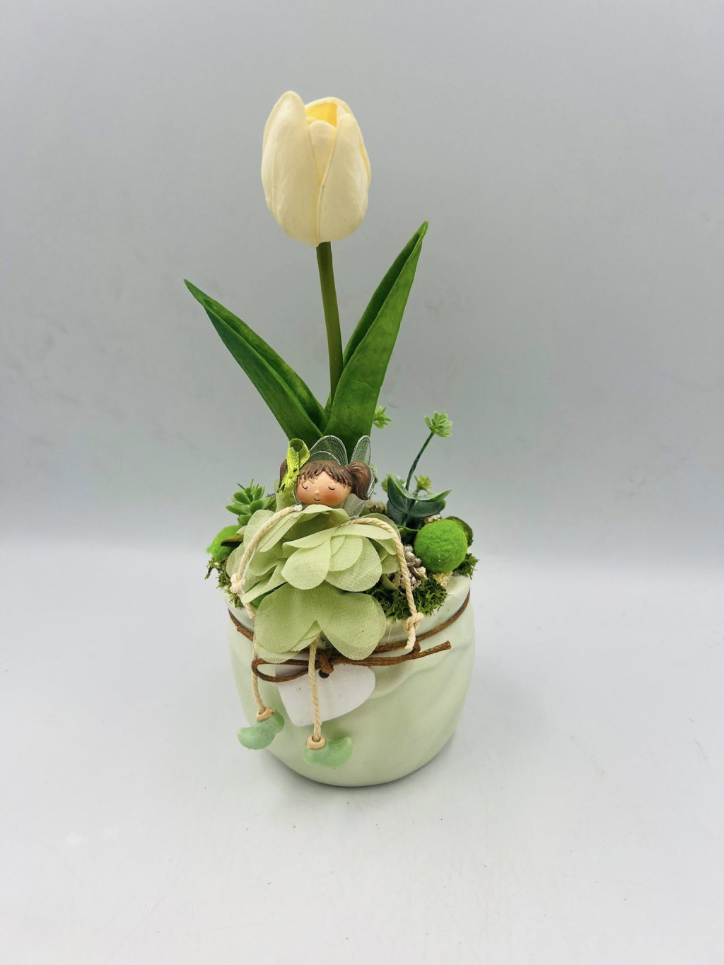 Asztaldísz fehér–zöld színvilágban figurával, kerámia kaspóban