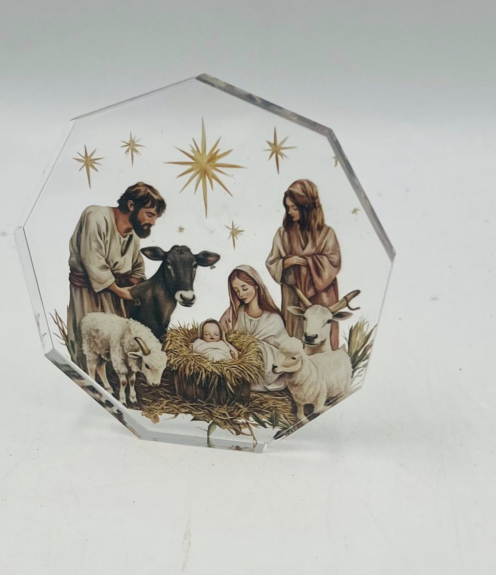 Ez a 9 cm-es, vastag plexiből készült betlehemes dísz gyönyörű, részletgazdag nyomattal készült, amely a Szent Családot és az állatokat ábrázolja meghitt, békés hangulatban.
