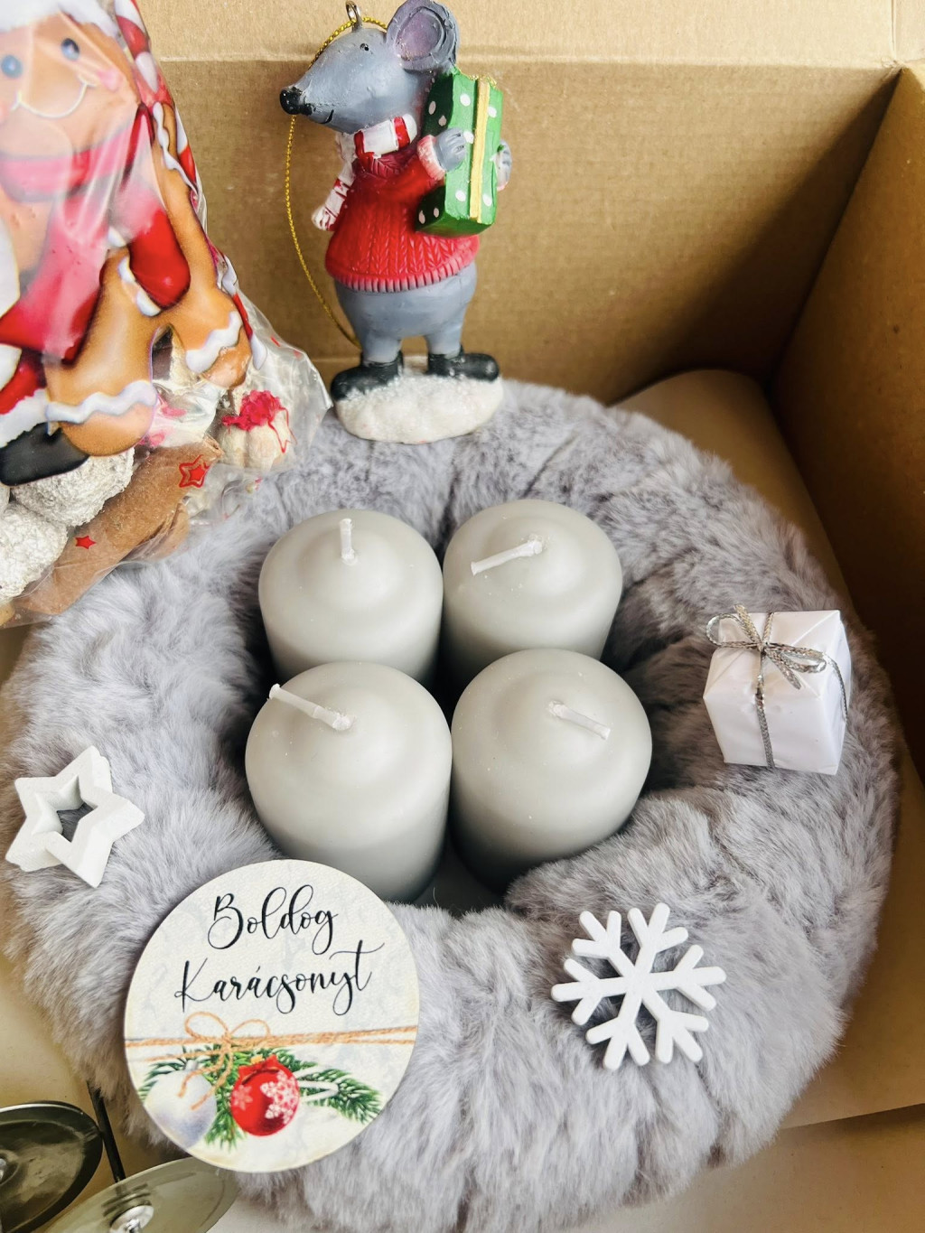 DIY BOX – szürke szörmealapon, 20 cm, szürke gyertyával, gérlány figurával és klasszikus karácsonyi kiegészítőkkel