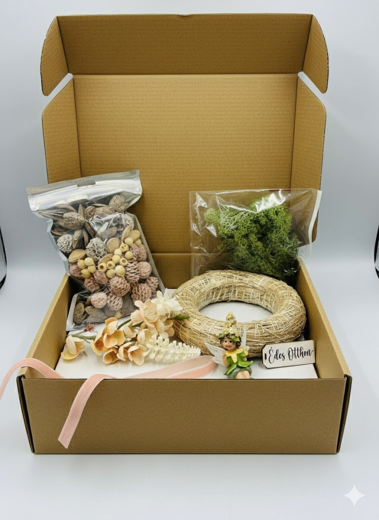 válogatott dekorációs elemek (száraz termések, mohák, virágok, figurák – a készlet jellegétől függően)