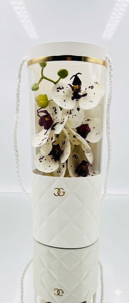 Ez a különleges, papír hengerben elhelyezett orchidea kompozíció igazán elegáns és időtálló ajándék bármilyen alkalomra. Az élethű műorchidea virágok finom kidolgozásukkal és természetes hatásukkal teszik igazán exkluzívvá ezt a dekorációt.
