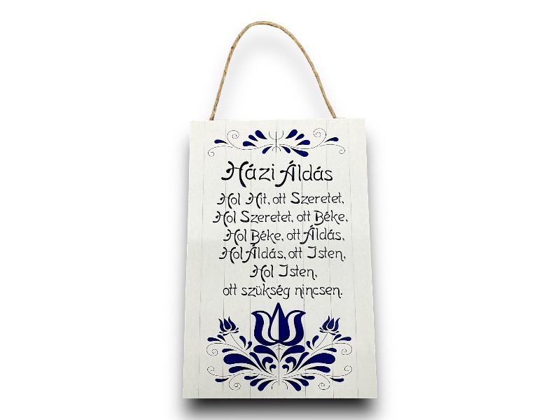 Ez a fatábla „Házi áldás” felirattal elegáns és otthonos dekoráció, amely a bejárati ajtón, a konyhában vagy a nappaliban is jól mutat. A fehér alapon kék minta hagyományos, harmonikus stílust ad, míg a „Házi áldás” felirat a család és az otthon védelmét szimbolizálja.