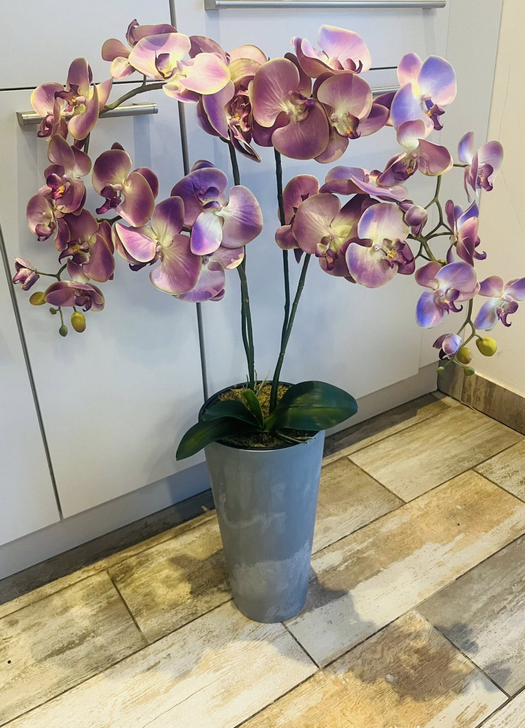 Lila orchidea padlóvázában 4 szálas szürke kaspós