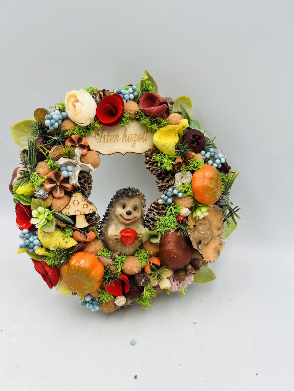 Szalma alapra készült, termésekkel gazdagon díszített, kedves őszi ajtódísz, amelynek középpontjában egy bájos kerámia süni áll.