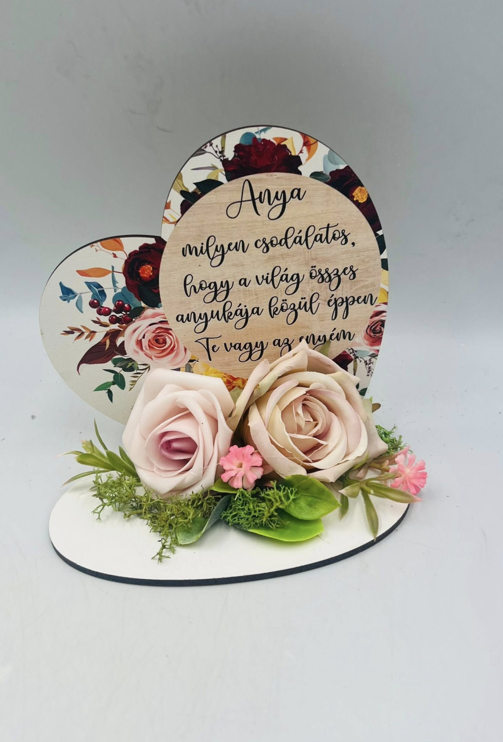 Kedves és szívhez szóló ajándék anyák napjára vagy bármilyen alkalomra ez a szív alakú asztaldísz, amely elegáns virágkompozícióval és megható felirattal készül. A 13,2 x 12,8 cm-es méret ideális kisebb asztalra, polcra vagy ajándékként átadásra.