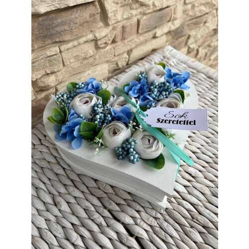 A 22 x 22 cm méretű dekoráció gyönyörű kék és fehér árnyalatú, élethű művirágokkal készült, melyek harmonikus és modern megjelenést biztosítanak. A szív forma és a gondosan összeállított virágkompozíció igazán különlegessé teszi ezt az ajándékot.