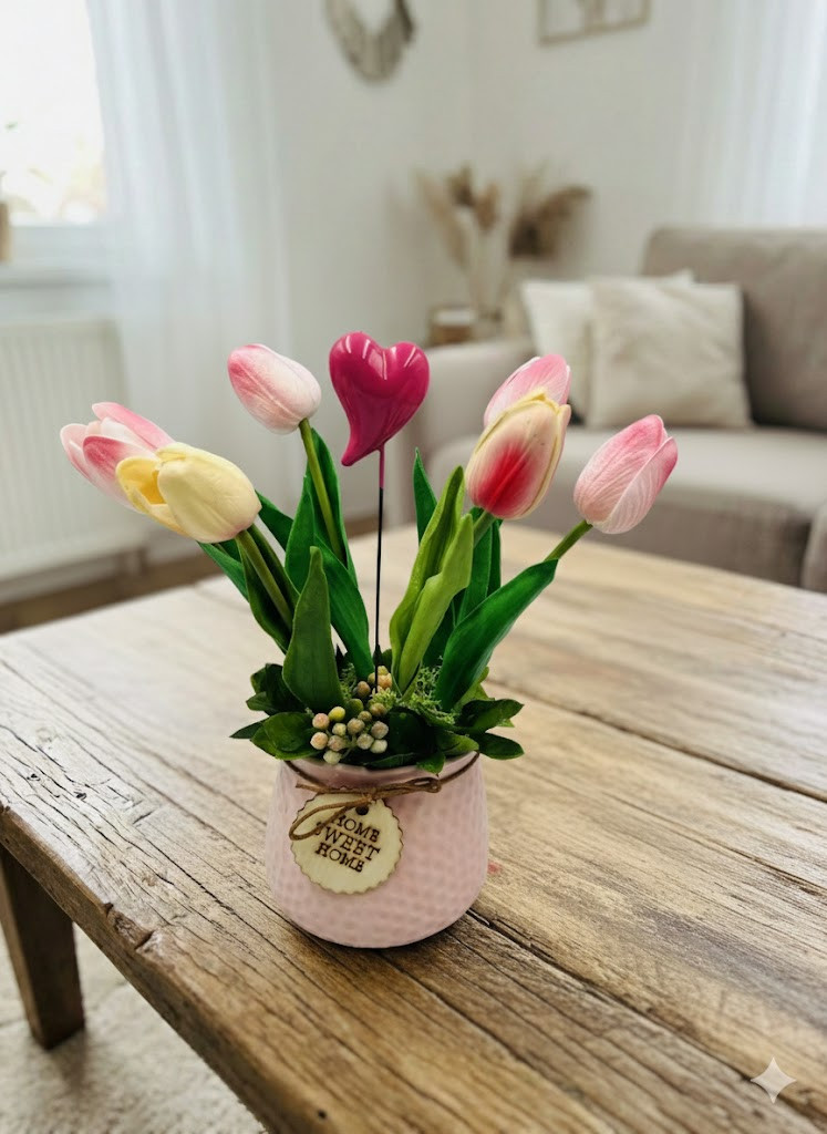 Ez a bájos tulipános asztaldísz igazi tavaszi hangulatot varázsol otthonodba. A rózsaszín kerámia kaspó elegáns és romantikus megjelenést ad, míg a gondosan elhelyezett tulipánok friss, üde összhatást teremtenek.