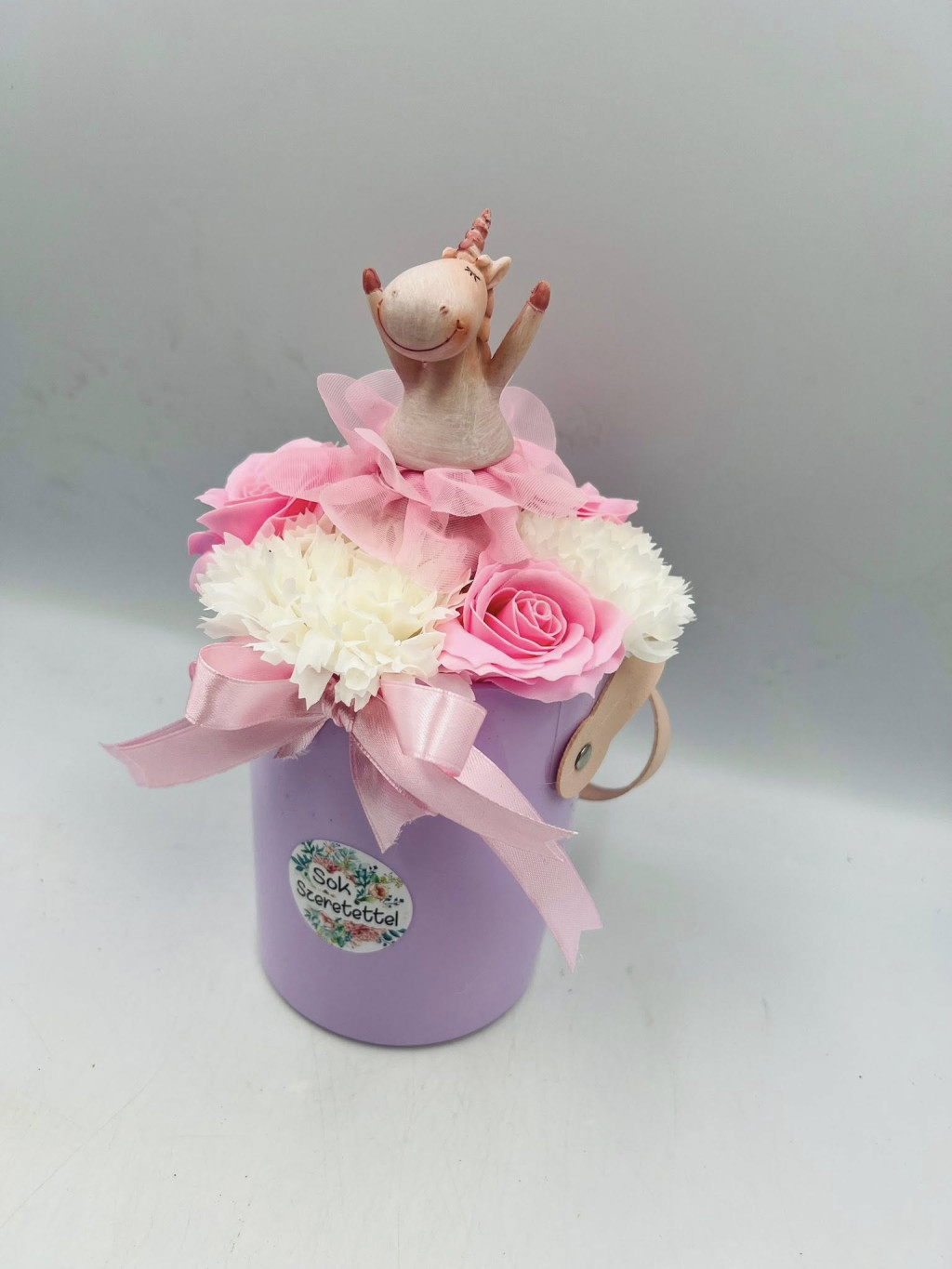 A boxban elhelyezett unikornis figurát fehér és rózsaszín virágok díszítik, amelyek lágy, elegáns megjelenést kölcsönöznek az összeállításnak. A dobozhoz tartozó „Sok szeretettel” felirat még személyesebbé és szívhez szólóbbá teszi az ajándékot.