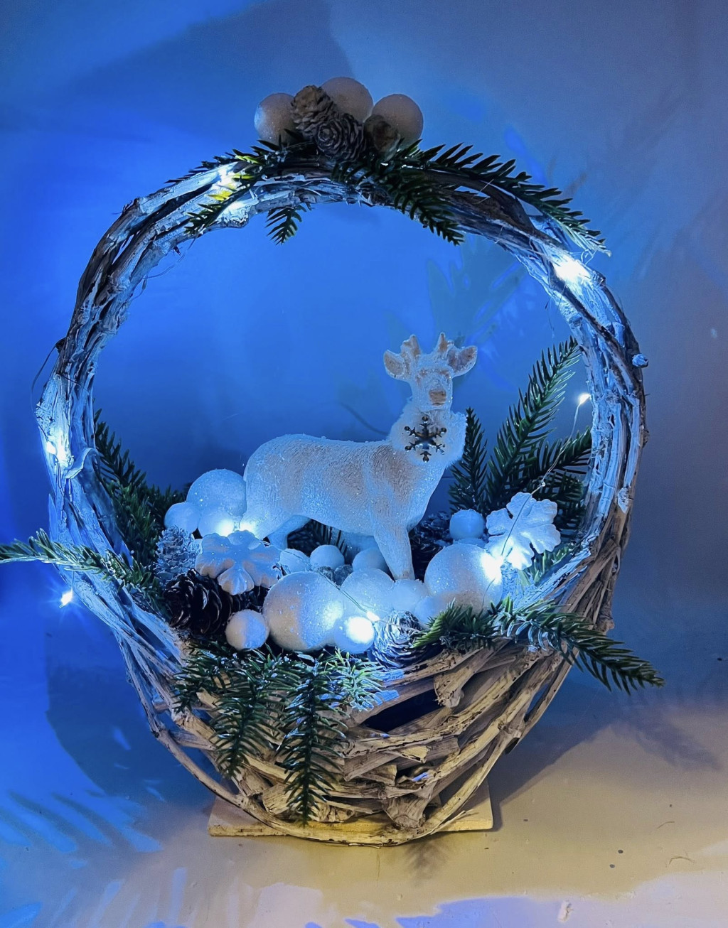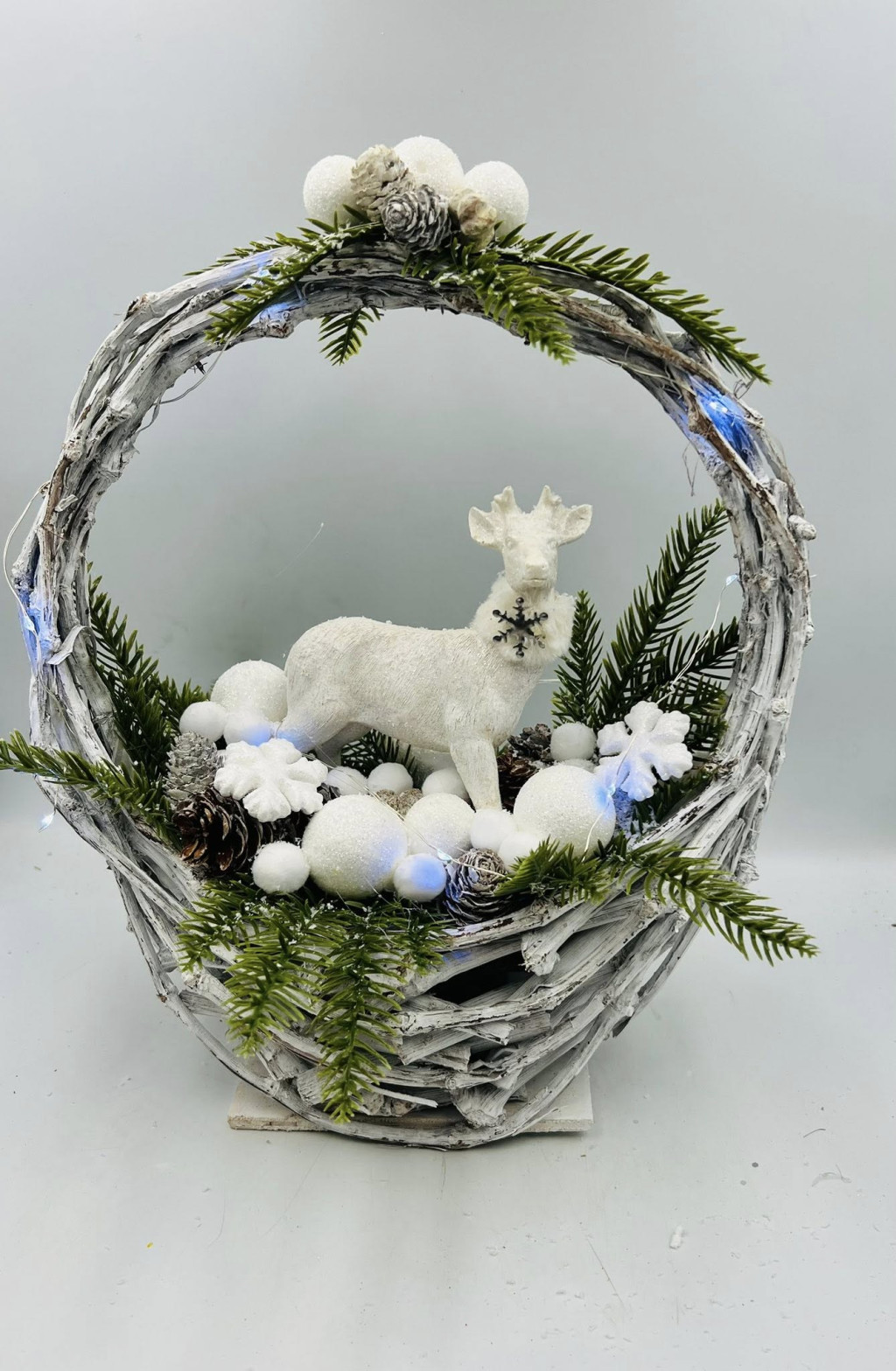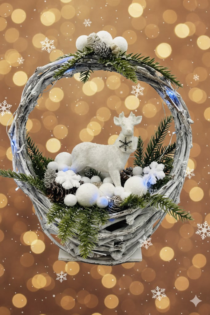 Elegáns, mégis természetes hangulatot árasztó karácsonyi vendégváró dekoráció 30×38 cm-es vessző kosárban. A kompozíció központi eleme a fehér szarvas figura, amelyet hófödte hatású műfenyő, fehér díszek és finom téli részletek vesznek körül.