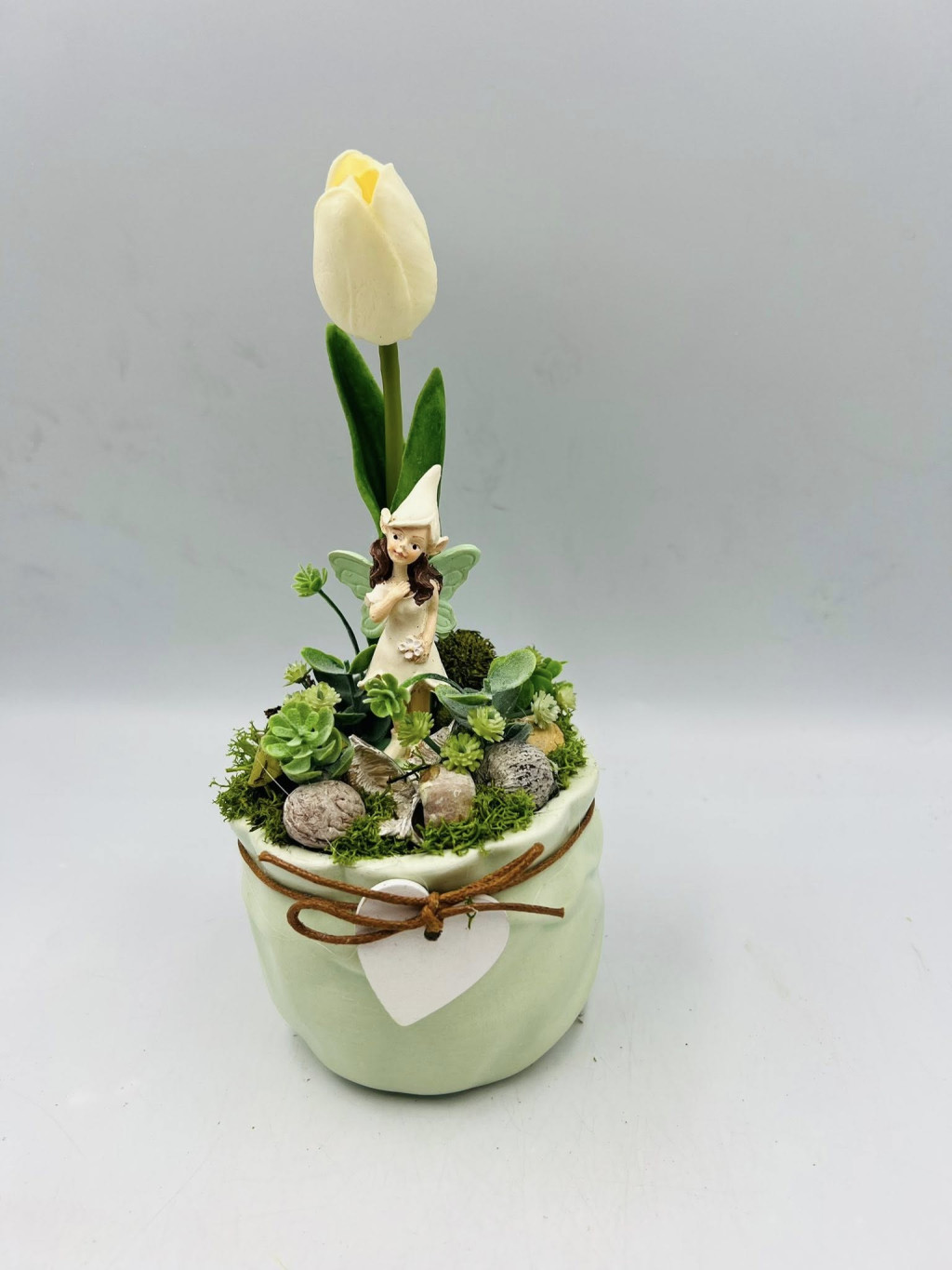 Vidám, zöld figurával díszített asztaldísz, kb. 30 cm magasságban, a virágokkal együtt mérve. Letisztult, elegáns kerámia kaspóban készült, minden eleme maradandó és gondozásmentes dekoráció. Tökéletes választás asztalra, polcra vagy ajándéknak.