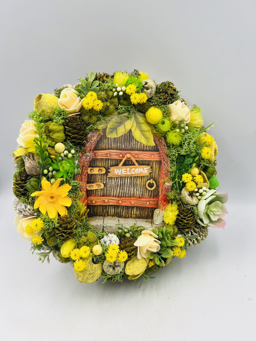 Vidám, üde hangulatú tavaszi ajtódísz, amely már az érkezés pillanatában barátságos légkört teremt. A középpontban egy rusztikus hatású „Welcome” ajtómotívum kapott helyet, melyet friss zöldekkel, sárga virágokkal és természetes elemekkel gazdagon díszített koszorú ölel körbe.