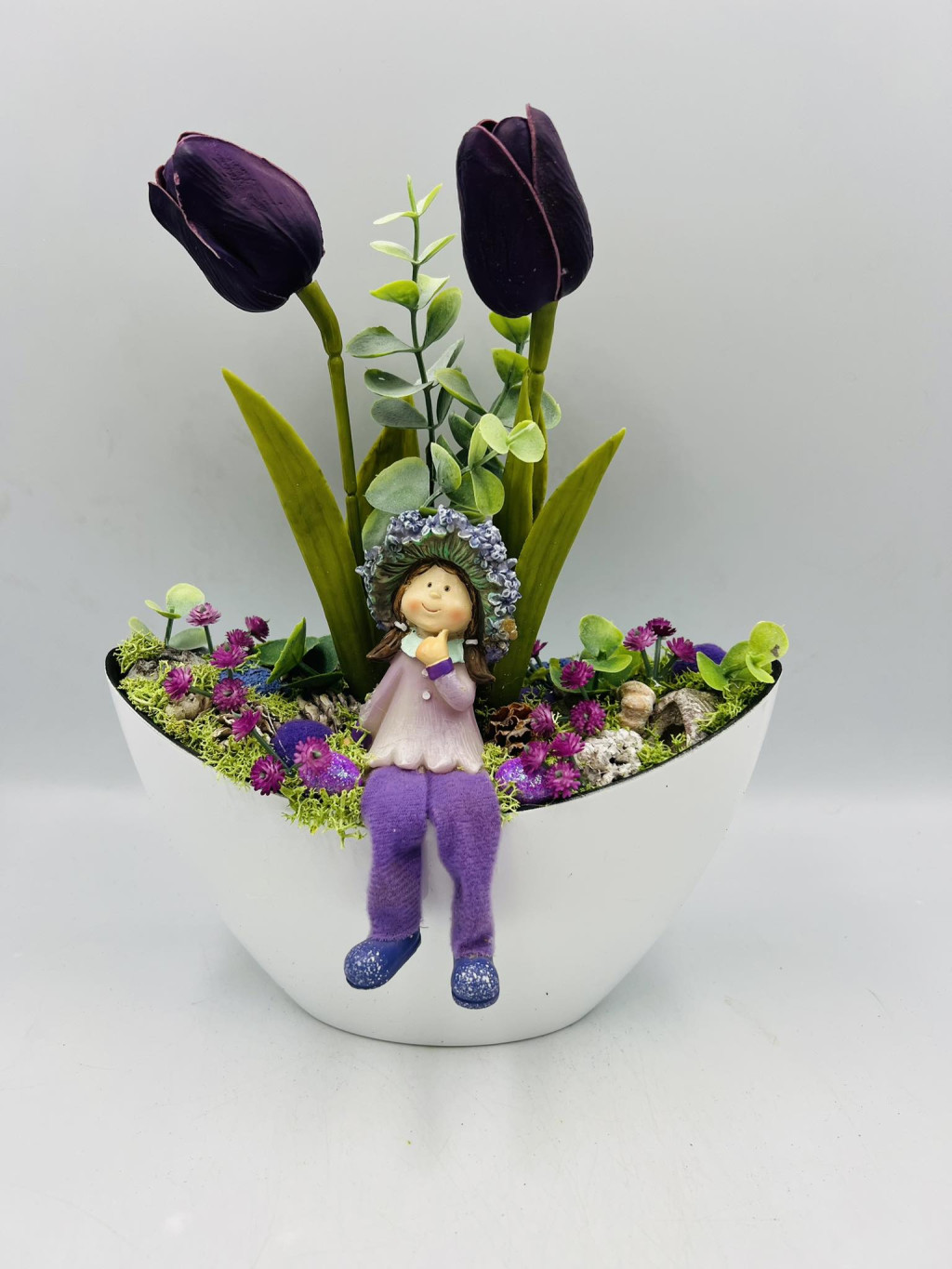 Ez a kb. 20 cm-es asztaldísz fehér csónak kaspóban készült, bájos lila virágtündérrel és harmonikus lilás díszítőelemekkel. Mesés, finom hangulatot teremt, tökéletes választás tavaszi dekorációként vagy különleges ajándéknak. Minden része maradandó, nem igényel gondozást.