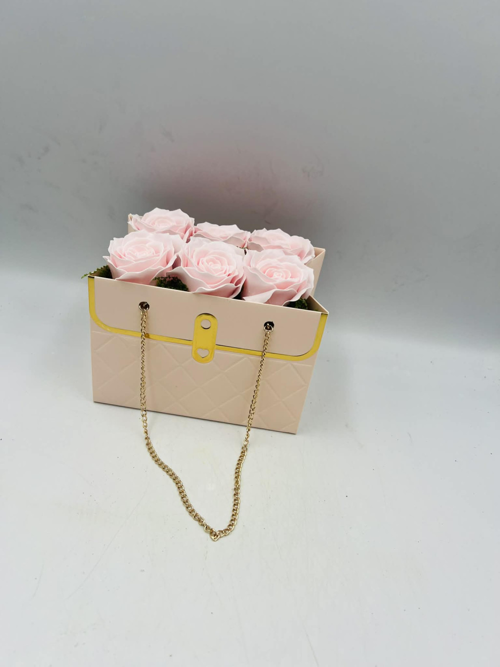 Ez a stílusos, táska formájú ajándékdoboz gyönyörű, barackszínű szappanrózsákkal készült, melyek nemcsak dekoratívak, hanem finom illatukkal is meghitt hangulatot teremtenek.